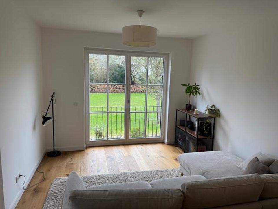 Der lichtdurchflutete Wohnbereich bildet das Herzstück der Wohnung. Große Fensterflächen sorgen für eine angenehme, helle Atmosphäre und schaffen eine Verbindung zum Außenbereich. Der **Balkon in Südausrichtung** mit Blick in den Garten lädt zum Verweilen ein.