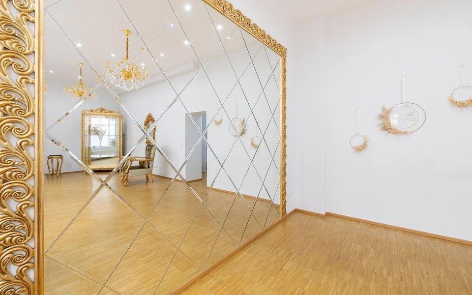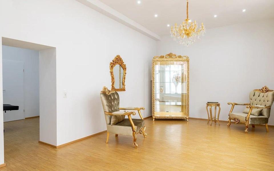 Die optional nutzbare Premium-Einrichtung umfasst einen imposanten XXL-Wandspiegel mit edler Goldrahmung (ca. 3m breit), eine elegante Empfangstheke, einen repräsentativen Glasvitrinenschrank, einen luxuriösen Kristall-Kronleuchter. Diese Einrichtung verbleibt im Eigentum des Vermieters und wird dem Mieter kostenfrei zur Nutzung überlassen.