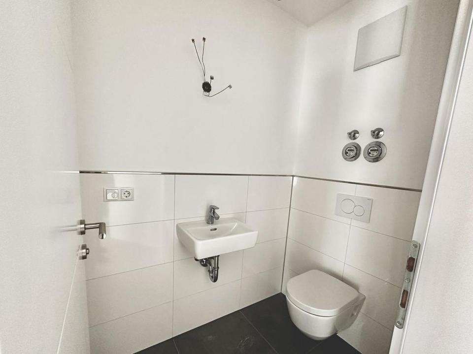 Im Erdgeschoss befindet sich zusätzlich ein praktisches Gäste-WC und ein Abstellraum, der für noch mehr Komfort sorgt. Über eine elegante Treppe gelangt man in den oberen Bereich der Wohnung, der mit einer kleinen, charmanten Galerie besticht. Das wunderschöne Geländer verleiht dem Raum eine besondere Note und öffnet den Blick auf den unteren Bereich der Wohnung. Der lange, großzügige Flur im Obergeschoss führt zu den drei Schlafzimmern, die ebenfalls durch bodentiefe Fenster viel Licht und eine angenehme Atmosphäre bieten. Diese Zimmer sind der perfekte Rückzugsort – ruhig und großzügig gestaltet.