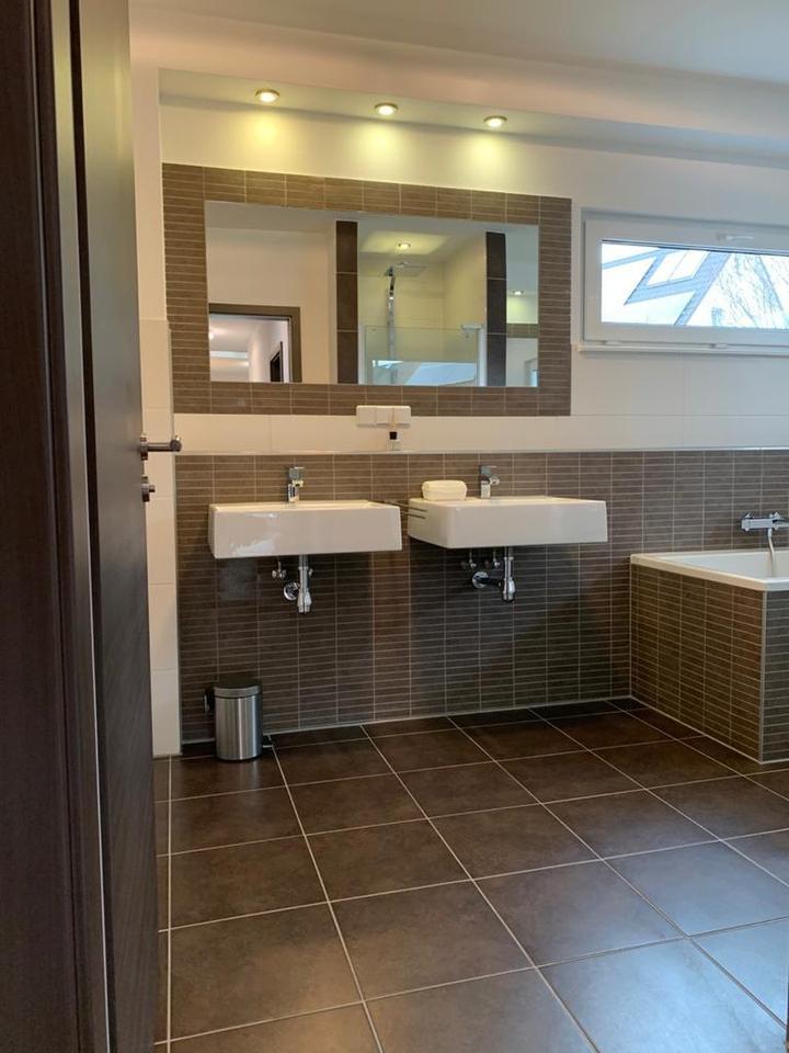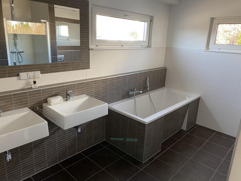 – Modernes Badezimmer mit Badewanne und Dusche