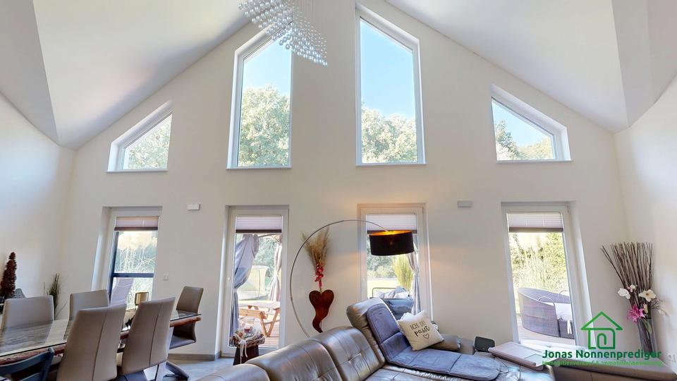 Das Highlight des Hauses ist das großzügige Wohnzimmer mit seiner offenen Decke, die für ein besonders lichtdurchflutetes und beeindruckendes Raumgefühl sorgt.