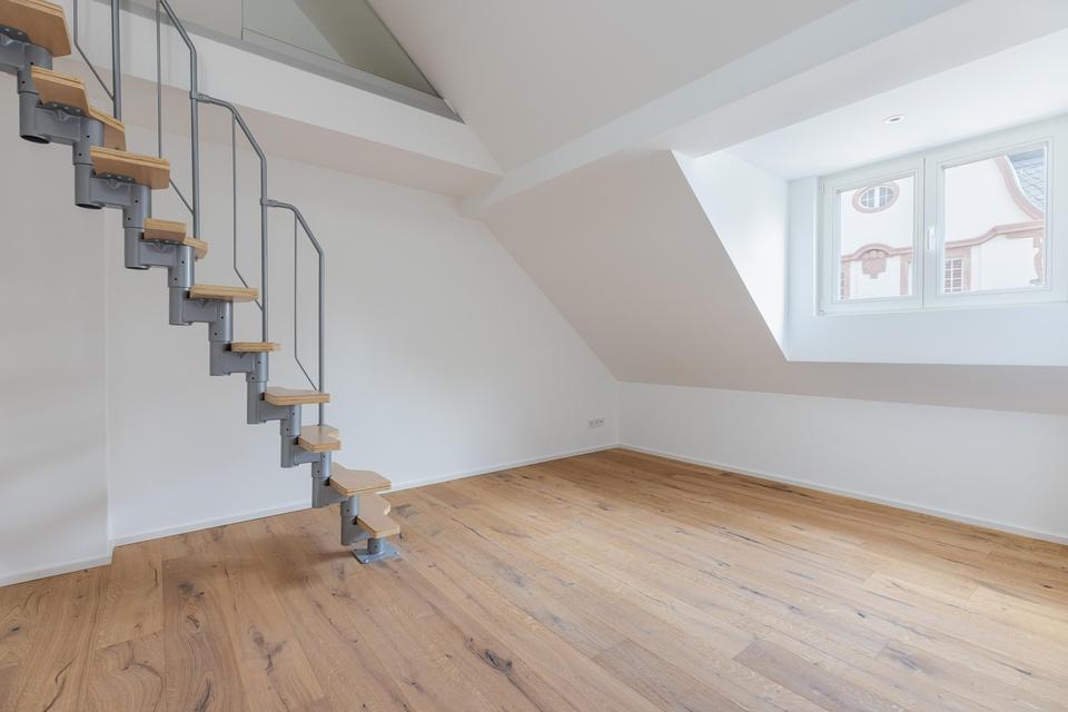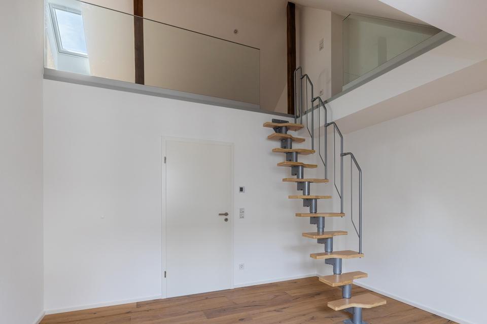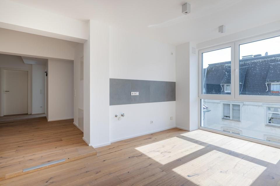 Das Highlight der Wohnung ist die weitläufige Dachterrasse, die einen unvergleichlichen Blick über die Dächer der Stadt bietet und zum Entspannen, Sonnenbaden oder geselligen Abenden mit Freunden einlädt. Große Fensterfronten sorgen für ein helles, freundliches Ambiente und schaffen nahtlose Übergänge zwischen Innen- und Außenbereich.