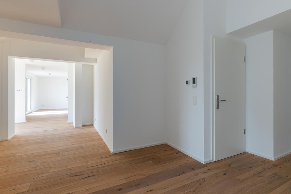 Neben der durchdachten Architektur überzeugt das Penthouse durch exklusive Ausstattungsmerkmale wie Parkettböden, Fußbodenheizung und Aufzug mit Direktzugang.