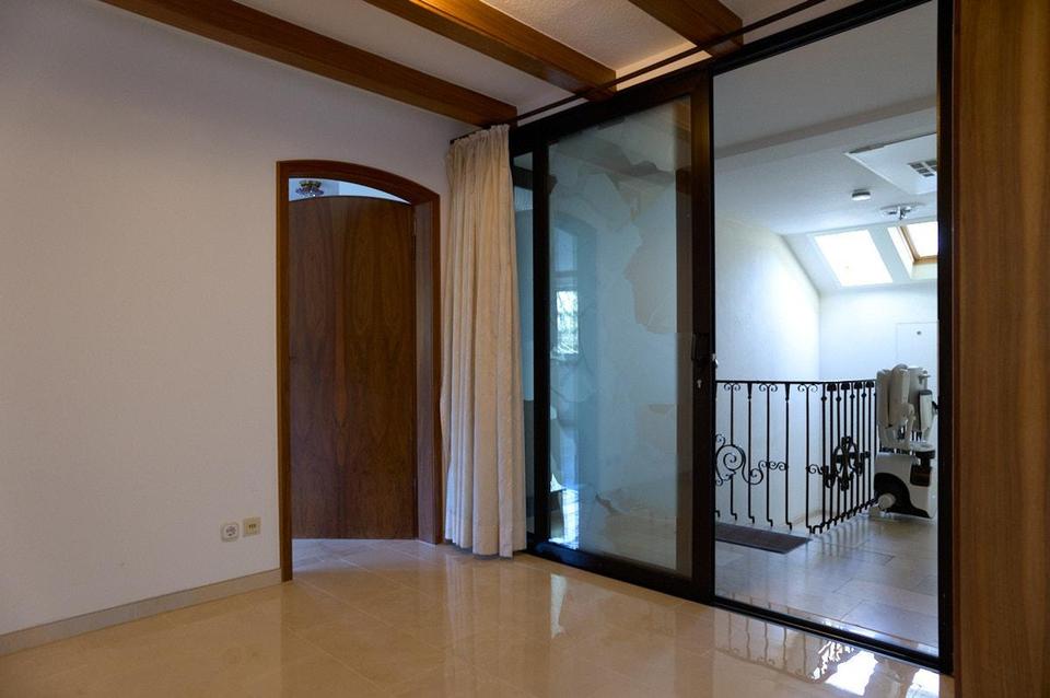 Das Schlafzimmer ist ein weiterer großzügiger Raum und überzeugt durch eine breite Fensterfront mit Blick ins Grüne. Der helle Natursteinboden sorgt für eine ruhige, wohnliche Atmosphäre. Einbaukleiderschränke bieten viel Platz für die Garderobe.