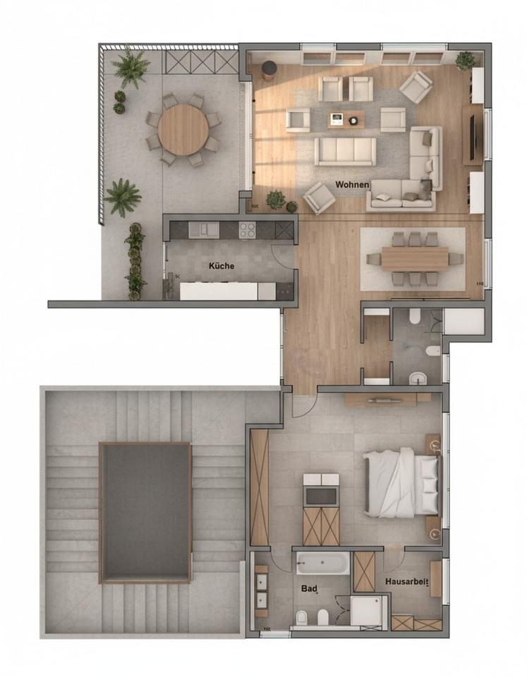 Der zentrale Wohnbereich beeindruckt durch seine außergewöhnliche Großzügigkeit. Der hochglänzende, helle Bodenbelag unterstreicht die Weite des Raumes und reflektiert das Tageslicht, das durch die großen Fenster in den Wohnraum fällt.