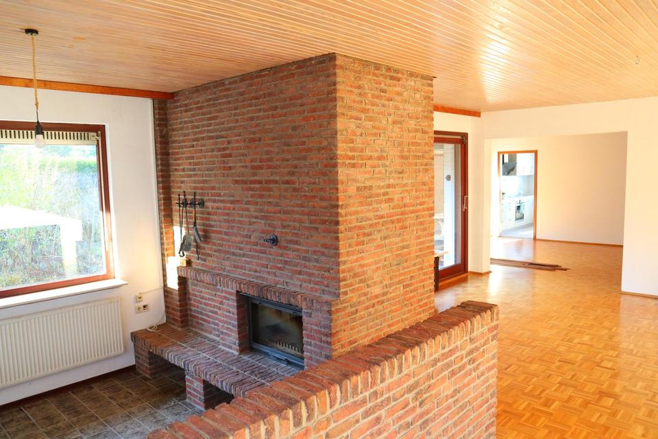 Das Herzstück des Hauses ist das große, lichtdurchflutete Wohnzimmer mit Parkettboden und integriertem Kaminzimmer – ein stilvoller Mittelpunkt für Familie und Gäste. Sowohl ein Innen- als auch ein Außenkamin sorgen für eine besondere Wohnatmosphäre zu jeder Jahreszeit und unterstreichen den behaglichen Charakter des Hauses.
