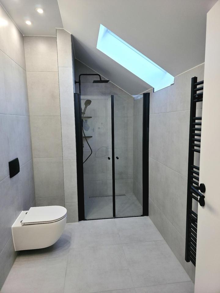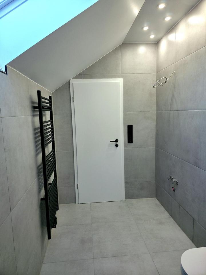 Das Tageslichtbad überzeugt mit bodengleicher Dusche und klarer Gestaltung. Für ein angenehmes Raumklima zu jeder Jahreszeit sorgt eine moderne Multi-Split-Klimaanlage, die sowohl kühlen als auch unterstützen beim Heizen kann und so zusätzlichen Komfort bietet.