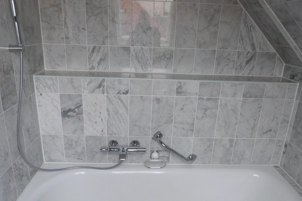 Das Bad und das Gäste-WC ist deckenhoch gefliest.