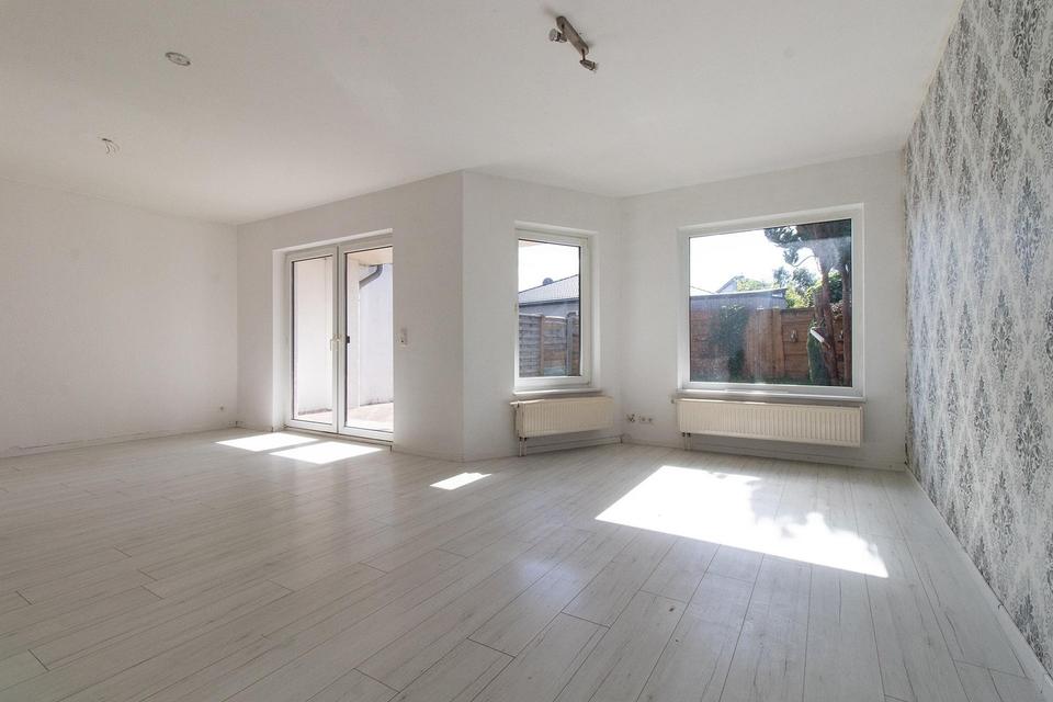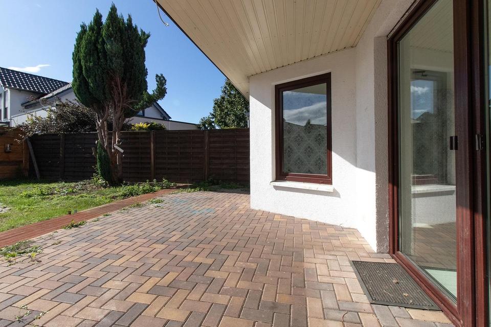 Hinter dem Haus liegt ein kleiner Garten sowie eine Terrasse, die vom Wohnzimmer aus erreicht wird. Das Grundstück hat insgesamt eine Fläche von ca. 202 Quadratmetern.