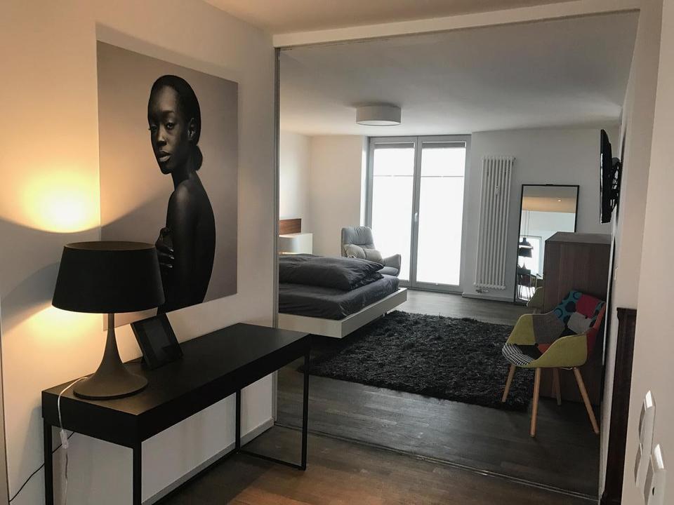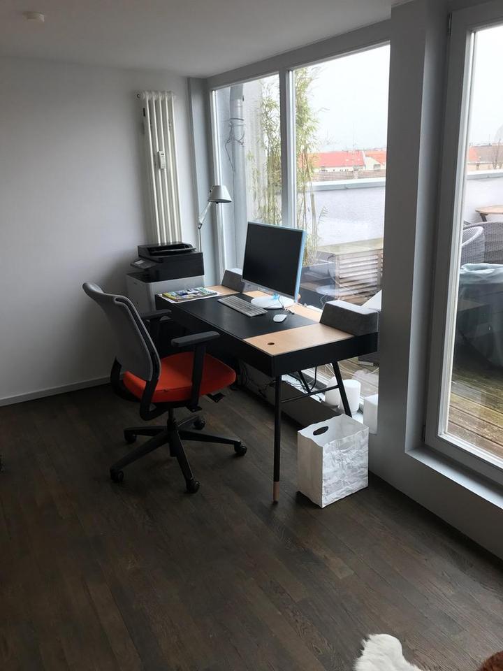 Ebenso auf der Galerie ist der Büro-Arbeitsplatz mit Blick auf die Dachterrasse. Hier gibt es einen 24″-Bildschirm für Laptops, Tastatur, Maus, Samsung Drucker/Scanner und natürlich 250 Mbit/s-WLAN/DSL in der ganzen Wohnung.