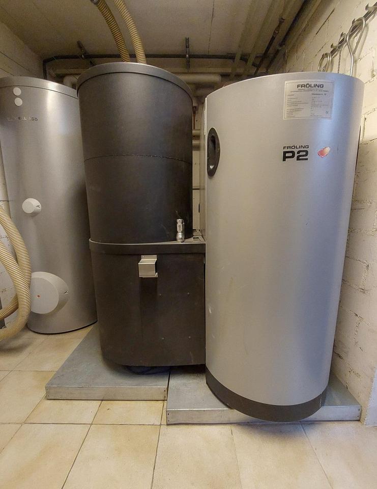 Die Zentralheizung wird über einen Pelletheizanlage (Einbau 2005) im Keller mit Warmwasserspeicher betrieben und durch einen Kachel-Grundofen (Einbau 1984) im Wohnzimmerbereich (EG) ergänzt. Daneben unterstützt eine Solaranlage (Einbau 2005) die Warmwassererzeugung, dadurch kann im Sommer auf die Heizung ganz verzichtet werden. Durch die Kombination dieser Optionen ist ein sparsamer Energieverbrauch möglich.