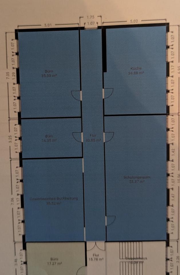 Fläche: Ca. 206 m² Nutzfläche, aufgeteilt in 4 helle Büroräume, einen Empfangsbereich und eine Küche.