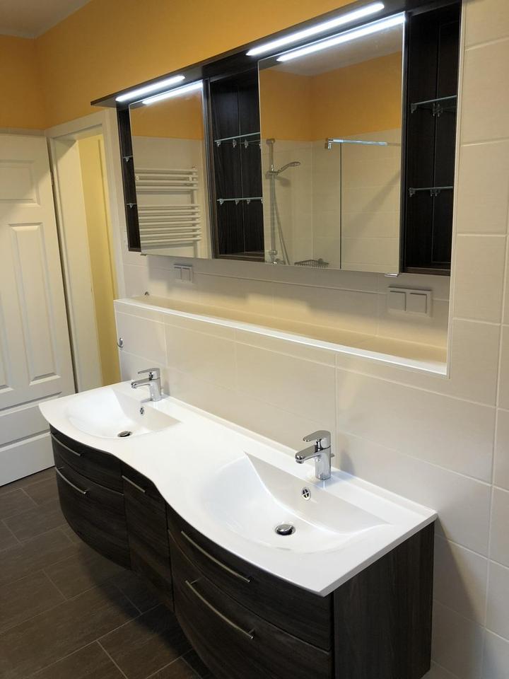 -zwei Bäder mit bodengleichen Duschen mit Glasabtrennungen und großen Badheizköpern(Handtuchtrockner), eines zusätzlich mit Badewanne und Doppelwaschtisch mit Unterbau und Spiegelschrank