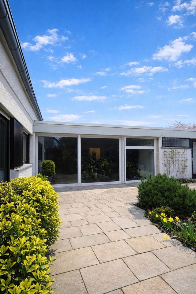 Im Erdgeschoß finden sich ein Wohn-/Esszimmer, 2 Schlafzimmer, die Küche, 2 Abstellräume, 2 Bäder, eine Gästetoilette sowie ein Panorama-Zimmer mit raumhohen Fenstern und Zugang zu einem nicht einsehbaren Innenhof. Über den von Wohn- und Schlafzimmer zugänglichen Balkon erreicht man über eine Außentreppe auch den Gartenbereich.