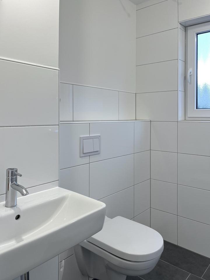 Das modern gestaltete Badezimmer ist mit einer ebenerdigen Dusche ausgestattet und sorgt für zusätzlichen Komfort im Alltag.