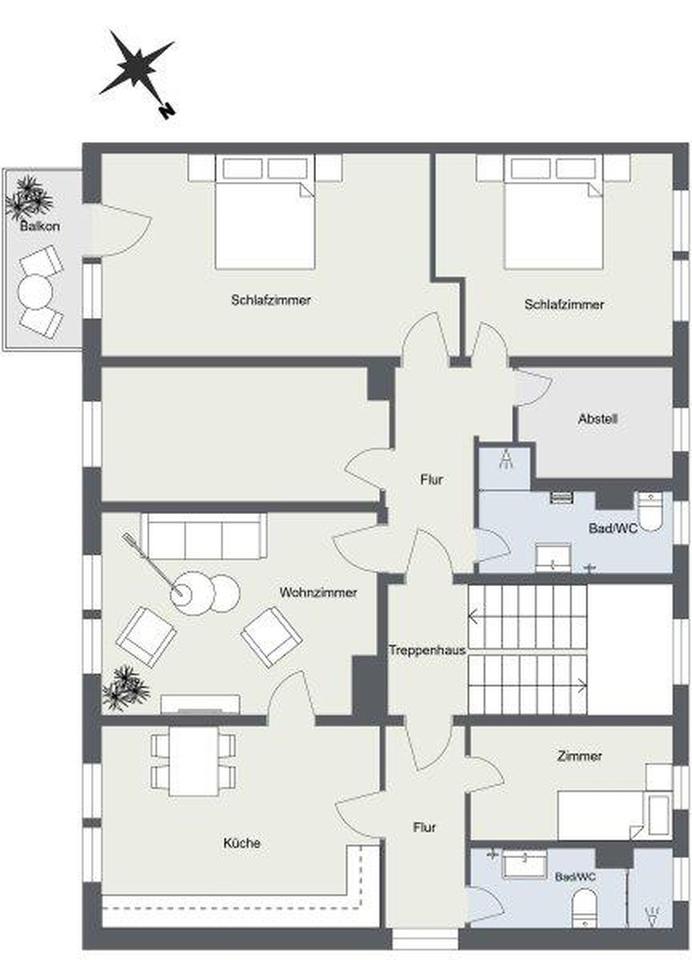 Beim Betreten der Wohnung gelangt man in einen hellen Flur mit Fenster, von dem aus rechts direkt ein Zimmer zugänglich ist, das entweder als Garderobe oder als zusätzlicher Raum genutzt werden kann. Weiter entlang des Flurs erreicht man das Badezimmer und gelangt in die großzügige Wohnküche, die ausreichend Platz für eine Küche und eine Sitzecke bietet. Direkt neben der Küche befindet sich das Wohnzimmer. Vom Wohnzimmer aus gelangt man durch eine Tür in den Wohn- und Schlafbereich mit drei Schlafzimmern, einem großen Abstellraum, der auch Platz für Waschmaschine und Trockner bietet, sowie einem weiteren Badezimmer. Von einem der Zimmer aus gelangt man auf den Balkon mit einer herrlichen Aussicht bis zum Isergebirge.