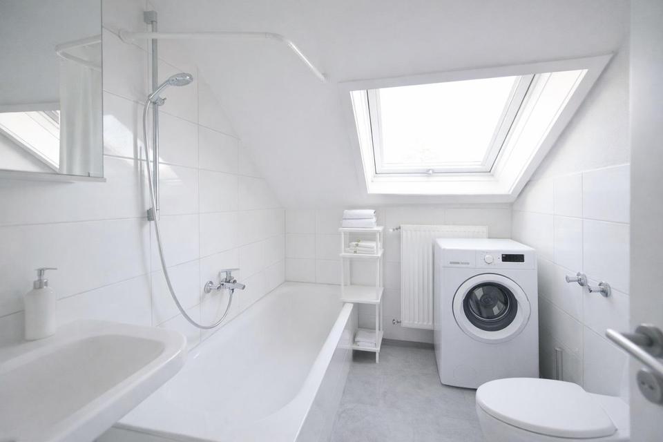 Das Badezimmer ist weiß und grau gefliest und mit einem Fenster ausgestattet, wodurch eine natürliche Belichtung und Belüftung gegeben ist.