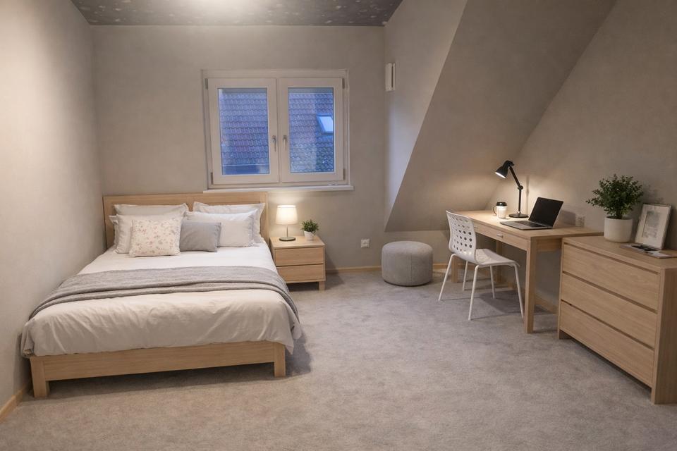 – im OG großzügiges Schlafzimmer mit indirekter Beleuchtung und Zugang zum Balkon