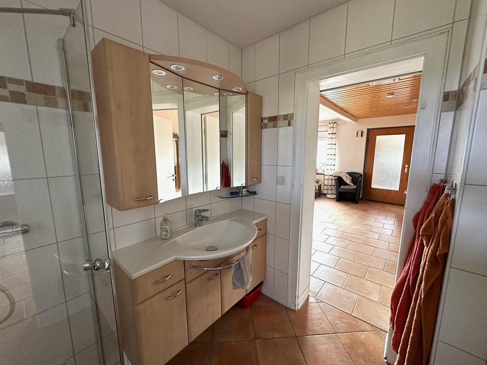 Im Erdgeschoss präsentiert sich die Immobilie in einem sehr gepflegten Zustand. Hier befinden sich ein großzügiges Esszimmer, ein helles Wohnzimmer, ein Schlafzimmer sowie die Küche und ein modernisiertes Badezimmer. Der Eingangsbereich bietet zusätzlich Potenzial zur Abtrennung und kann bei Bedarf als weiteres Zimmer genutzt werden. Das Treppenhaus verbindet die beiden Geschosse miteinander und kann somit als Zweifamilienhaus genutzt werden.