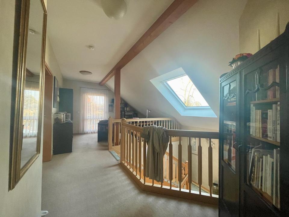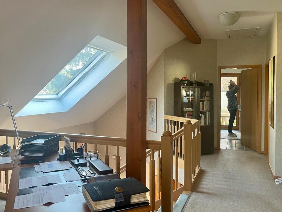 Mit überschaubarem Aufwand können, ebenfalls ohne Eingriff in die Statik, durch einen kleinen Umbau die bereits bestehenden zwei großen Schlafzimmer zu drei Schlafzimmern umgestaltet werden, so dass dann im Haus insgesamt fünf Schlafräume/Arbeitszimmer möglich sind. Heizkörper sind bereits jetzt ausreichend so installiert, dass dieser Umbau ohne Änderungen an der Heizungsanlage möglich ist.