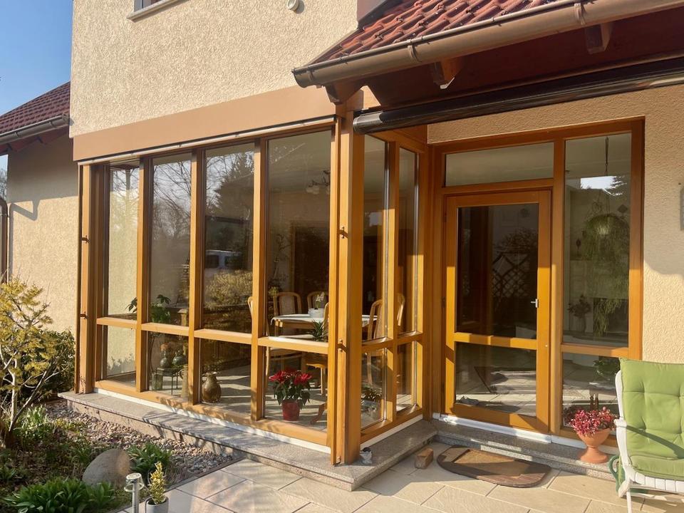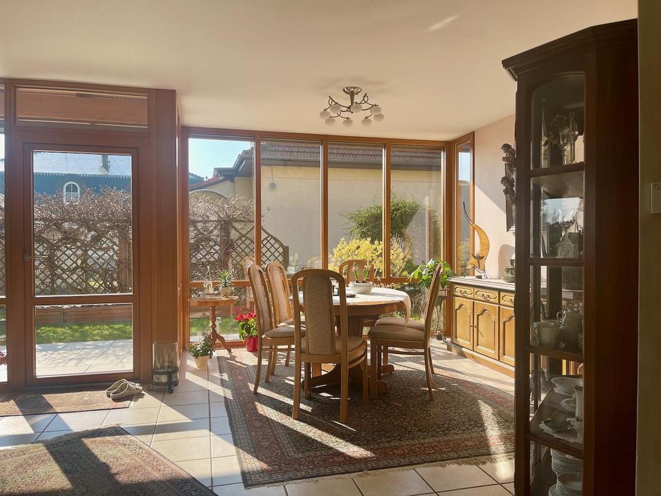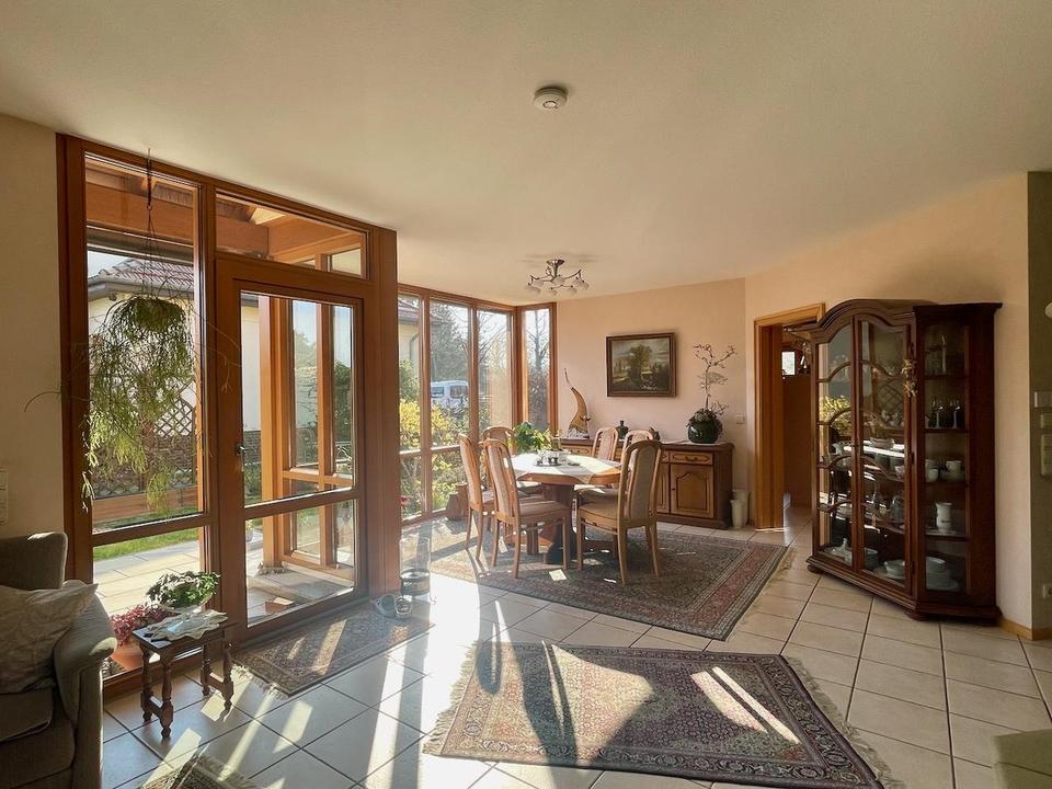 Wohn- und Essbereich gehen ineinander über; hier wurde schon schon so manches Familienfest gefeiert. Die Terrasse ist teilüberdacht und mit einer Markise ausgestattet. Im EG gibt es noch ein Gästezimmer mit eigenem Terrassenzugang und das angrenzende Duschbad.