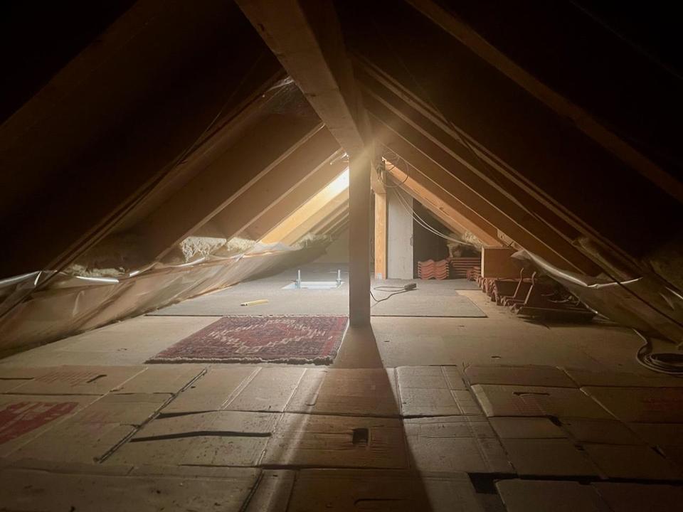 Über eine Luke mit Scherentreppe erreicht man den Dachspitz, der als Lagerraum dienen kann.