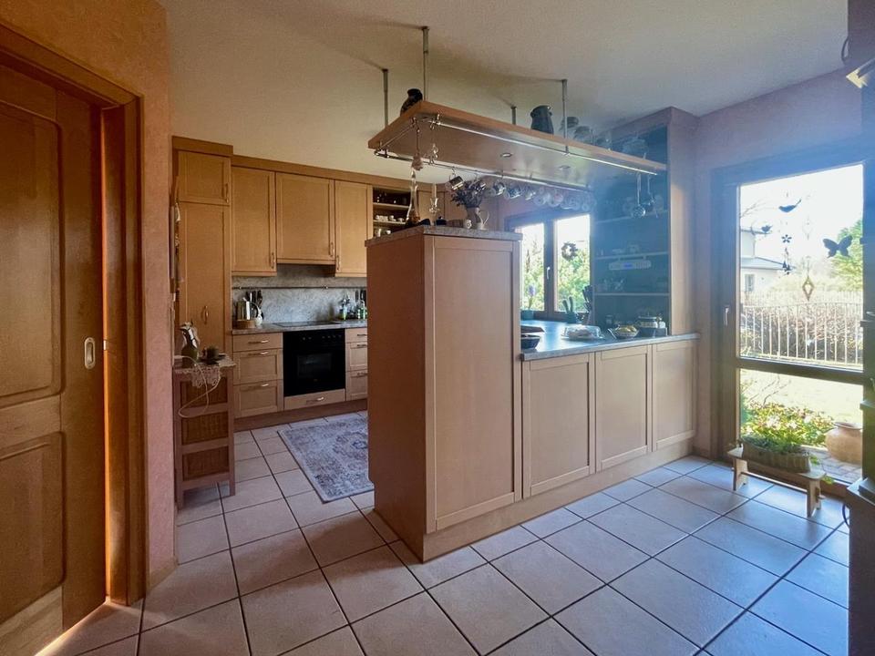 An die große Küche mit vorhandener Einbauküche schließt sich direkt eine Speisekammer an. Die Küche hat zwei Innentüren in Form von in der Wand laufenden Schiebetüren zum Flur und zum Essbereich, sowie Fenster und Terrassentür nach Westen zur Straße. Die südliche Außenwand des Essbereichs ist nach Art eines Wintergartens ganzflächig verglast; eine außenliegende Raffstoreanlage sorgt bei Bedarf für Sonnenschutz mit gleichzeitigem Durchblick.
