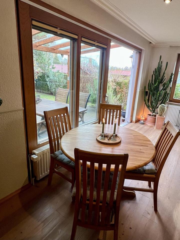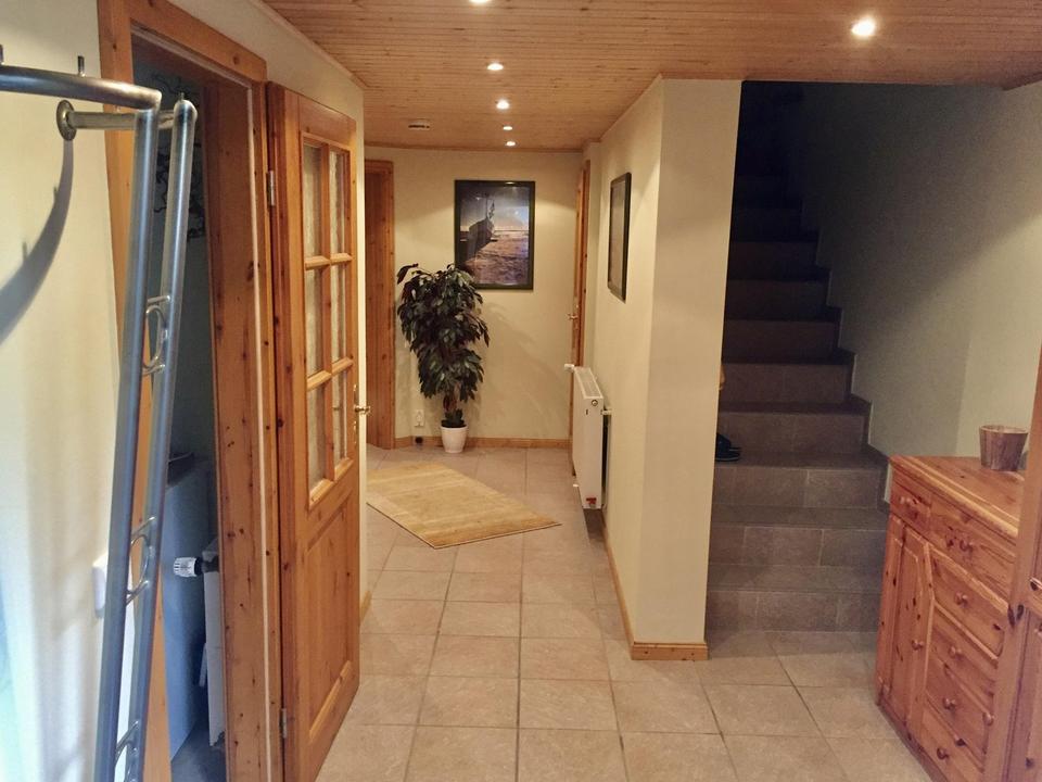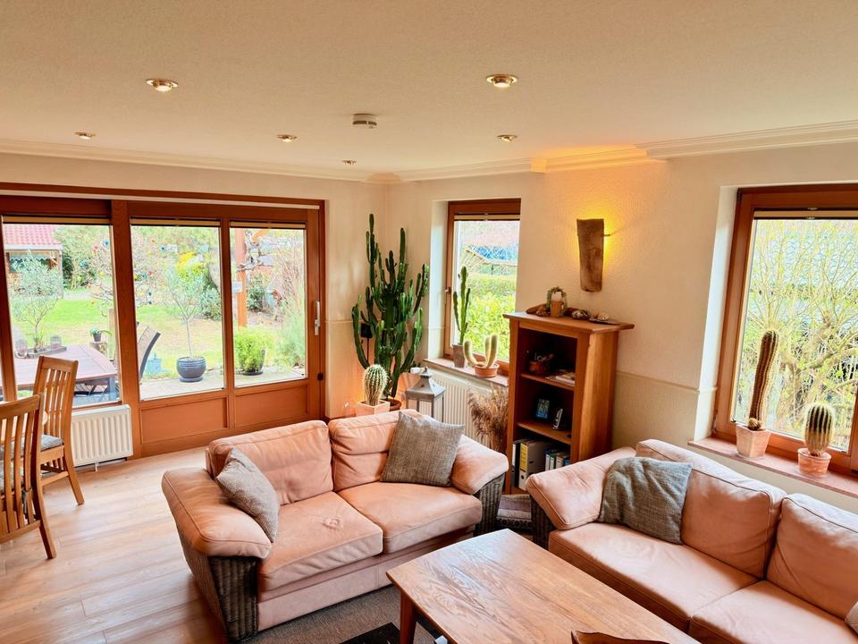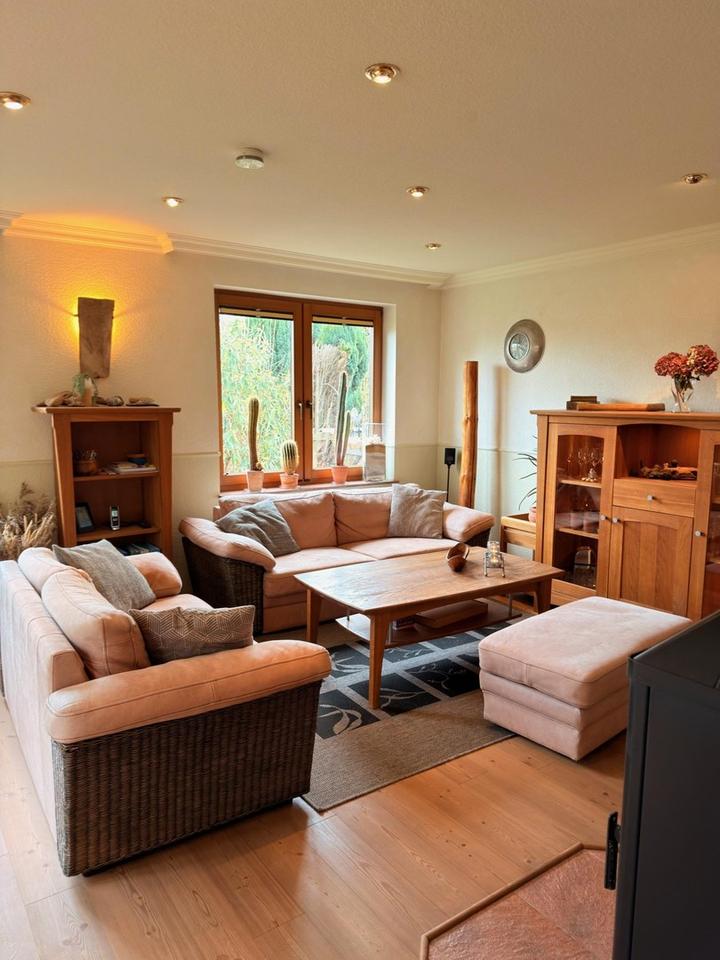 Das großzügige Erdgeschoß besteht aus einem großen hellen Flur mit Windfang, einem offenem Treppenhaus zum Obergeschoß, einer Küche mit Küchenzeile in L-Form, sowie einem Gäste-WC und einem hellen Wohnzimmer mit Echtholz-Parkett und Kaminofen.