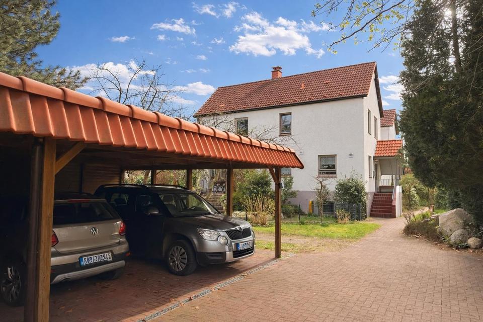 Aussen befindet sich eine dreifach Carport-Anlage mit zwei Geräteschuppen, von denen zwei Stellplätze und ein Geräteschuppen zu diesem Objekt gehören.