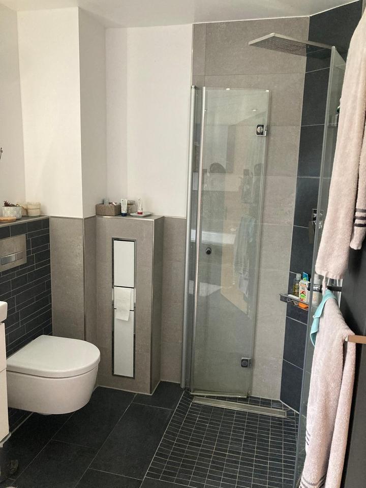 Im Obergeschoss befindet sich das 2017 modernisierte Bad mit Badewanne und ebenerdiger Dusche und 3 Schlafzimmer eins mit begehbaren Kleiderschrank.