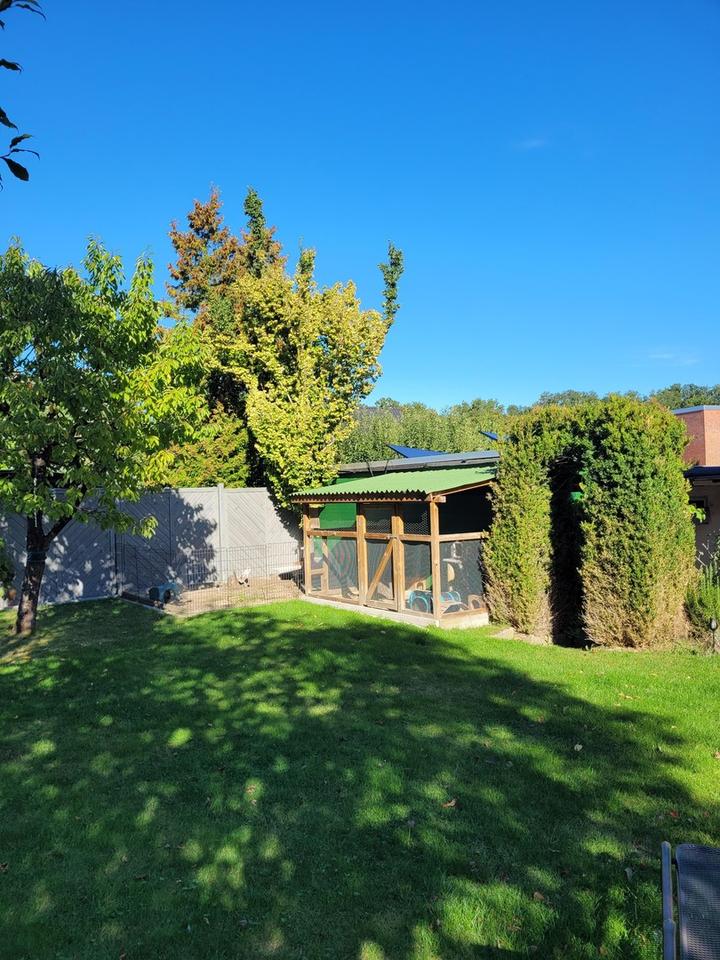 Der Garten ist allseitig mit Zäunen eingegrenzt und pflegleicht angelegt. Für Kleintierliebhaber gibt es einen Stall mit Innen- und Außenbereich (derzeit Kaninchengehege). Weiterhin befinden sich im Garten noch Unterstellbereiche (z.B. für Wäsche), ein Geräteschuppen, ein Spielhaus und eine Aufstellfläche für einen Pool (4x4m). Auf dem Geräteschuppen wurde 2025 ein Balkonkraftwerk mit Südausrichtung installiert.