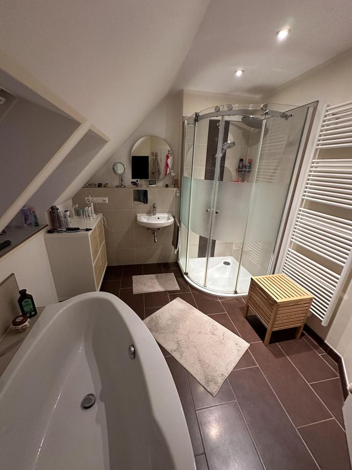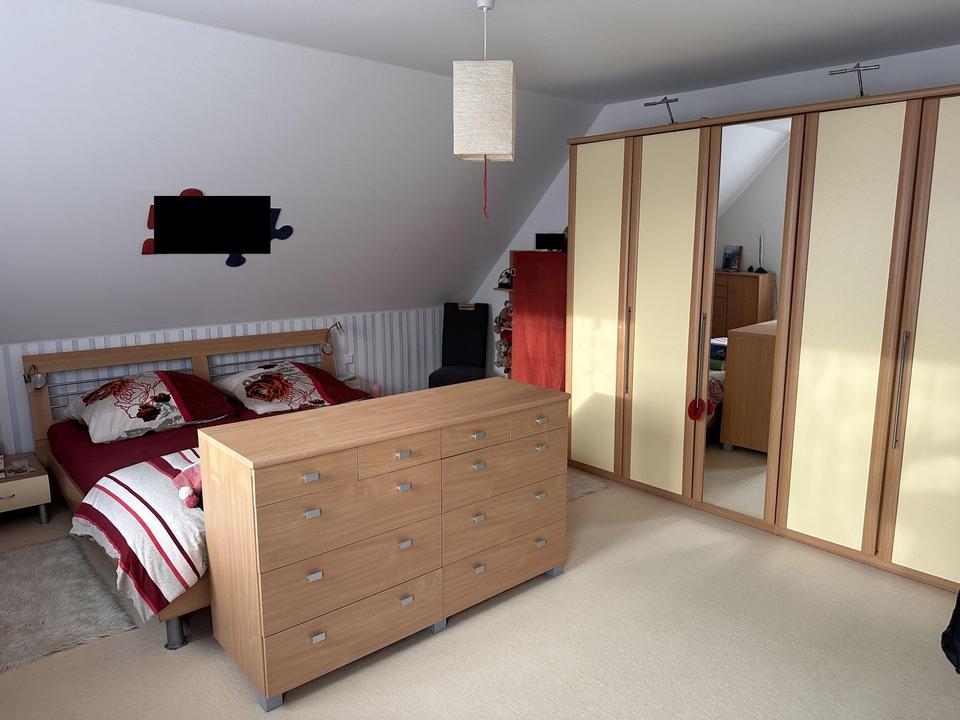 Über eine geschlossene Holztreppe gelangt man ins Obergeschoss. Hier befinden sich weitere 4 Räume. Ein Schlafraum ist mit einem separat zugänglichen WC und Einbauschrank ausgestattet. Im Obergeschoss befinden sich ein Dusch- und Wannenbad sowie ein weiteres WC mit Waschtisch.
