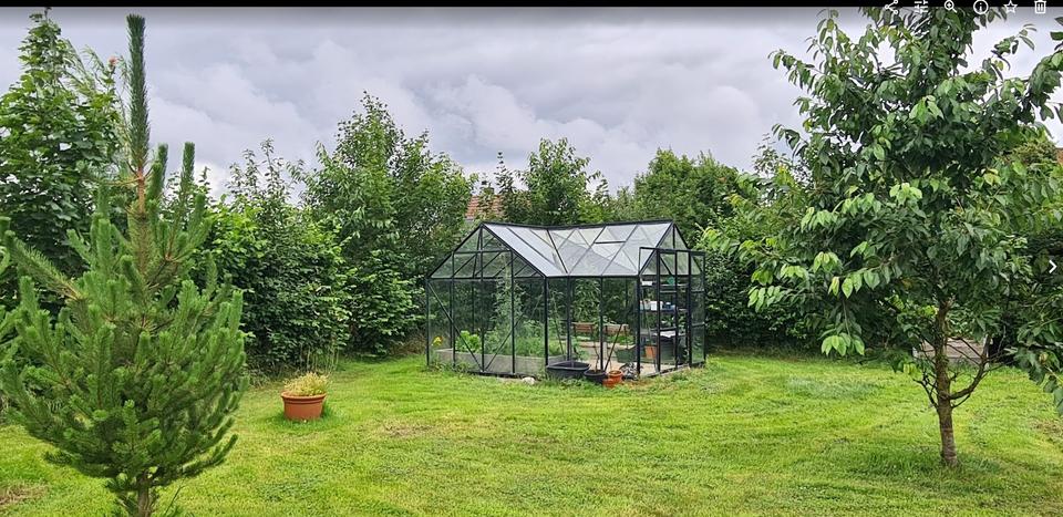 Outdoor-Paradies: Große Terrasse am Haus, 2.500 m² liebevoll angelegter Garten mit Obstbäumen, hochwertigem Glas-Gewächshaus und einem erschlossenen Gartenhaus (Sauna-Anschluss bereit).