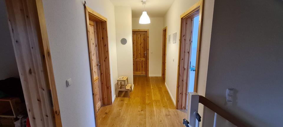 •EG und Flur OG hochwertiges Eichenparkett von Boen, weiße Raufasertapeten, überwiegend Fußbodenheizung, Eichenholztreppen, Dachboden