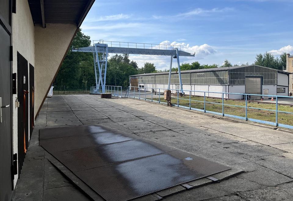 Neben der Verladerampe befindet sich ein ca. 8,0 m hoher Portalkran mit einer Tragfähigkeit von ca. 5.000 KG welcher auf einer Kran-Bahn (Fundamenten Kiesbett) von ca. 14,0 m breiten und ca. 80,0 m Länge über die Gleisen betrieben werden kann.