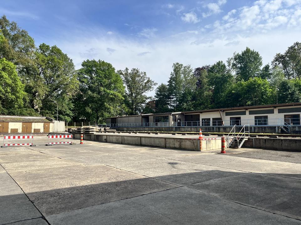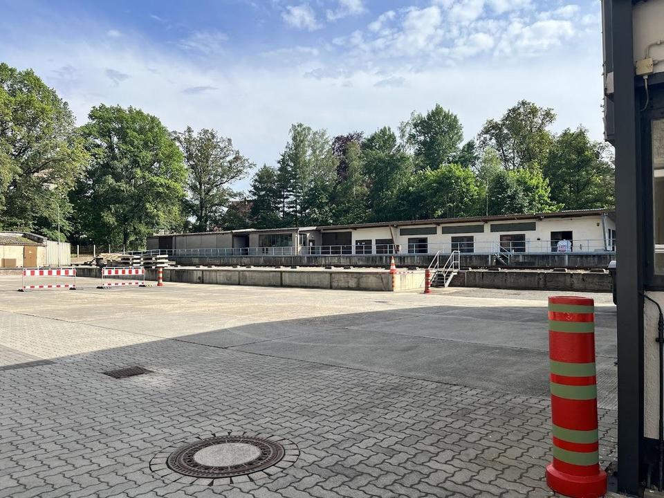 Es gibt eine etwa 60,0 m lange und ca. 6,0 m breite in stahleingefasst Beton-Verladerampe welche in ihren variablen Höhen verschieden an- und befahrbar ist.