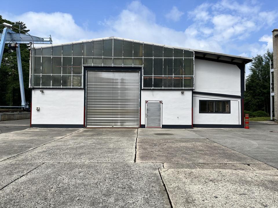 Im hinteren Bereich des Gebäudes gibt es einen ca. 270 m² großen separat gelegenen und abgetrennten Werkstattbereich mit zwei großen LKW – Montagegruben sowie einem weiteren Nebenraum. Die Hallenhöhe am Trauf beträgt ca. 6,00 m und am Fürst ca. 7,00 m. Die Zufahrt über die beiden Haupttore (isolierte Flügel-Tore 4,70 m x 4,70 m) ist selbst mit größeren Gespannen problemlos möglich.