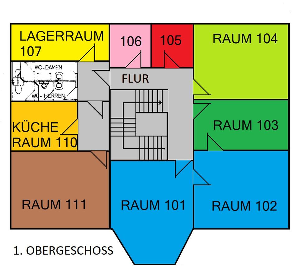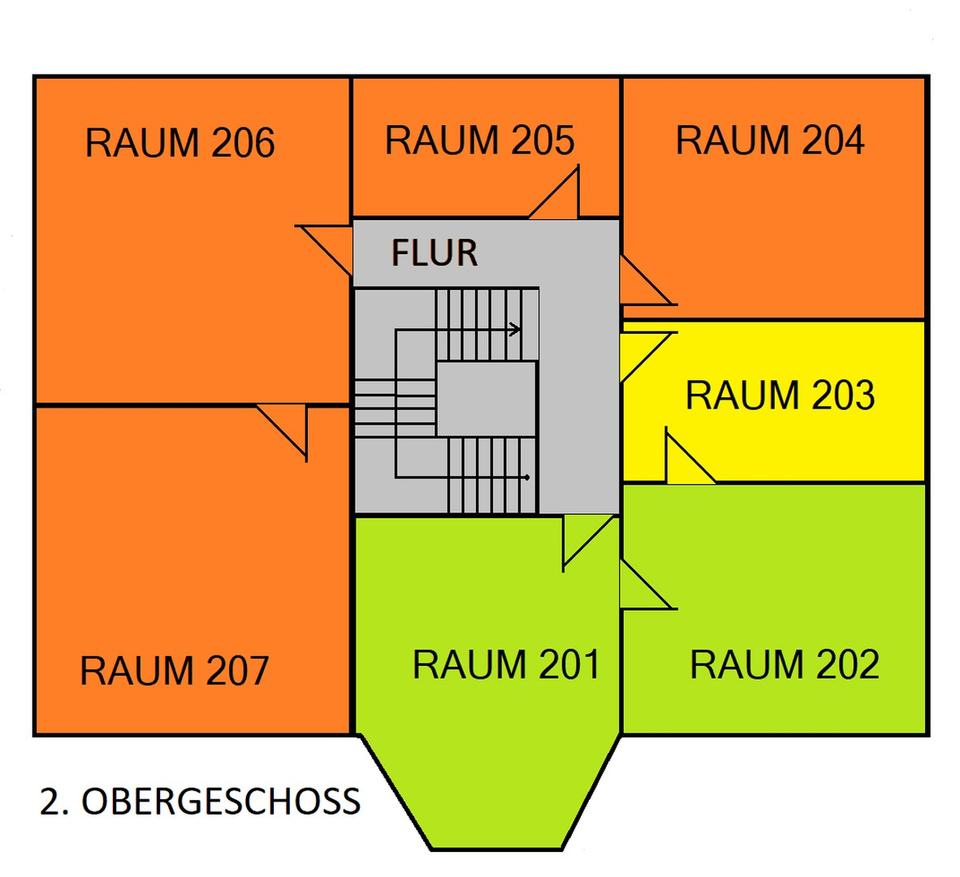 Raum 101, Raum 102 in 1.OG und 204, 206 und 207 im 2.OG- siehe Grundriss.