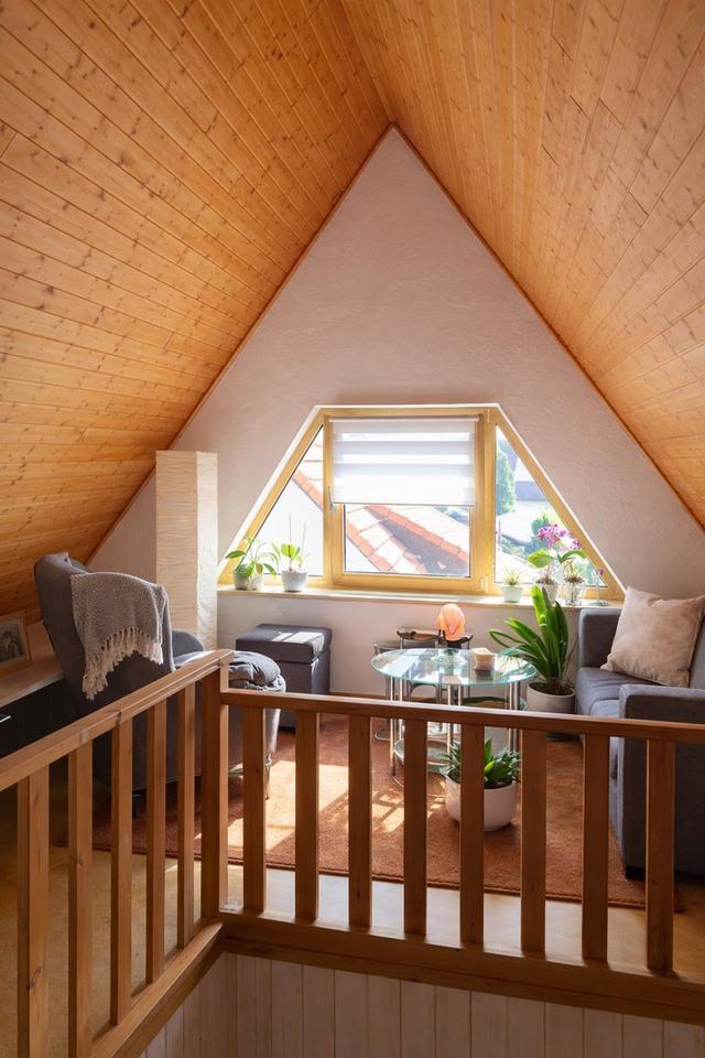 Über die innenliegende Wendeltreppe gelangt man in das Dachgeschoss mit Galeriecharakter. Hier befinden sich weitere großzügige Räume sowie ein großzügiges Badezimmer – ideal als privater Rückzugsbereich.
