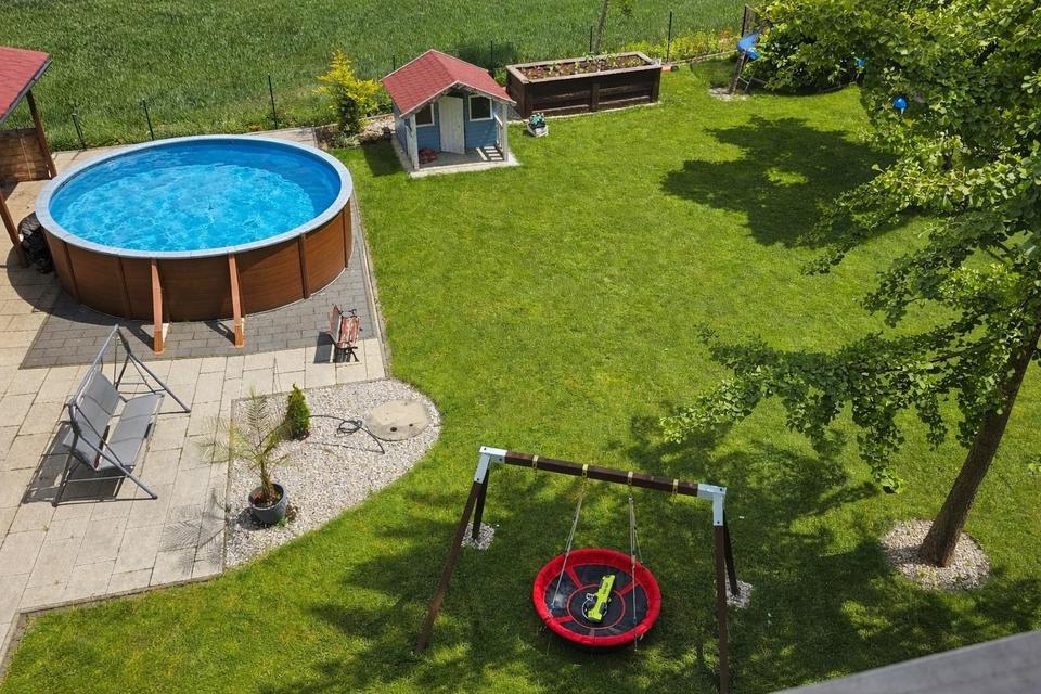Die befestigte Gartenfläche bietet vielseitige Nutzungsmöglichkeiten – aktuell wird sie saisonal für einen Aufstellpool genutzt.