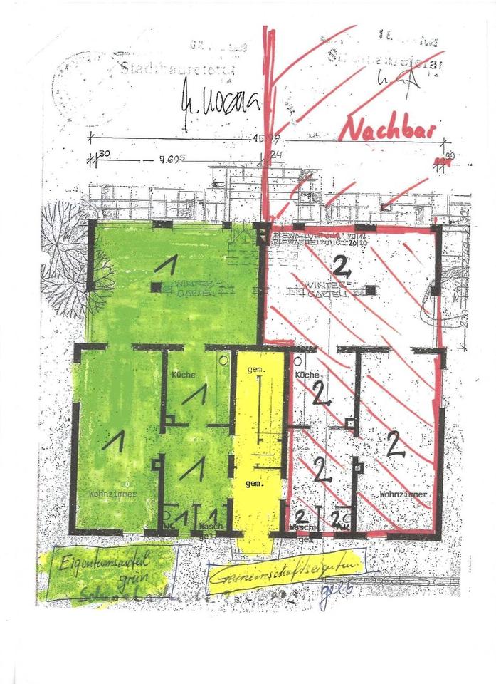 Auf den Originalplänen ist die angebotene Haushälfte in grün dargestellt.