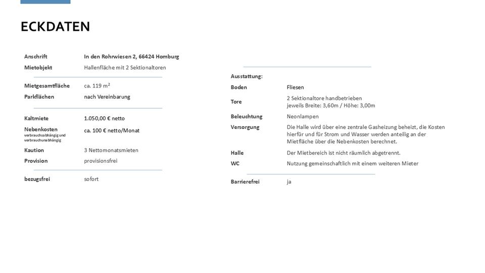 Das Gebäude befindet sich im Gewerbegebiet in Homburg-Erbach, an der Landstraße L118, einer stark frequentierten Straße. Die Umgebung ist geprägt von einer Vielzahl an Gewerbebetrieben, was Synergien und eine hohe Kundenfrequenz ermöglicht. Eine Tankstelle und eine Selbstwaschanlage sind in nächster Nähe.