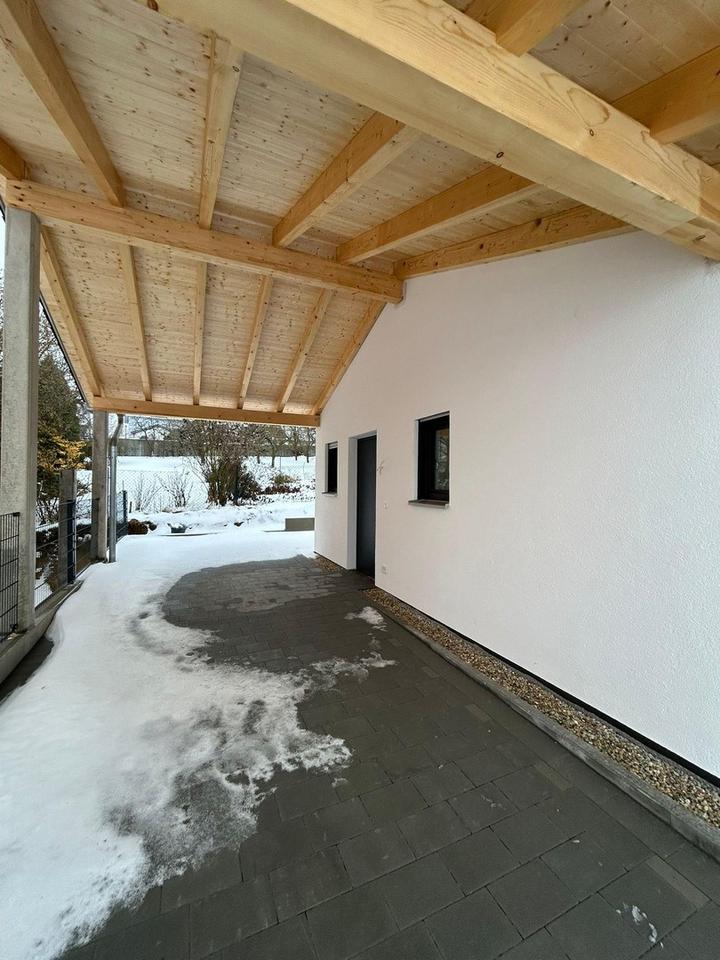 Zur hochwertigen Ausstattung gehören eine moderne Luftwärmepumpe, dezentrale Wohnraumlüftung, Fußbodenheizung, 3-fach verglaste Kunststofffenster mit 6-Kammern-Technologie in elegantem Grauton, edler Vinylboden in den Wohnräumen sowie hochwertige Fliesen in der Küche und in den Bädern. Elektrische Rollläden und Naturstein Fensterbänke unterstreichen die gehobene Ausstattung. Ein Carport-Stellplatz sowie ein zusätzlicher Außenstellplatz vor dem Carport bieten ausreichende Parkmöglichkeiten.