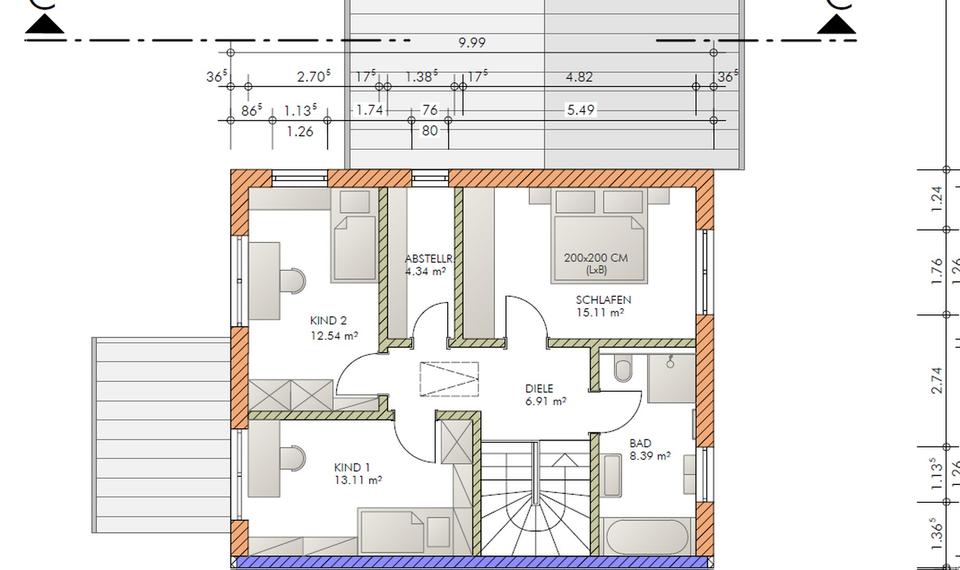 Im Obergeschoss befinden sich ein Elternschlafzimmer, zwei Kinderzimmer mit flexiblen NutzungsmÜglichkeiten, ein Tageslichtbadezimmer mit Badewanne, Dusche, WC, Waschbecken und ein praktischer Abstellraum fßr zusätzlichen Stauraum.