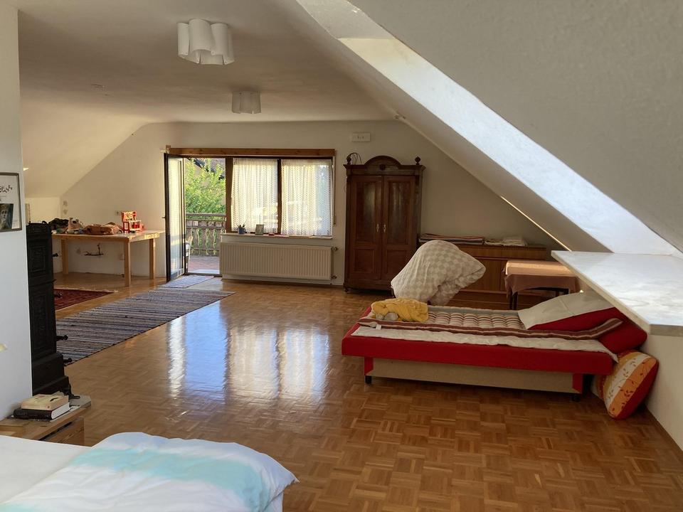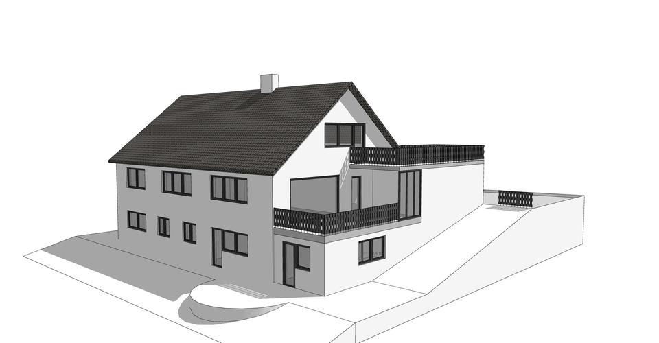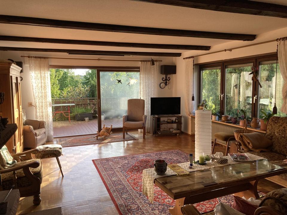 Das Zweifamilienhaus steht auf einem 1973 m² großen Grundstück mit einer Wohnfläche von 317m² und wurde 1974 in Massivbauweise errichtet. Das Haus ist in Nord-Südrichtung ausgerichtet und hat helle, lichtdurchflutete Räume. Den Sonnenuntergang kann man auf Freisitz vor dem Wohnzimmer genießen. Das Esszimmer hat einen Kachelofen und das Wohnzimmer einen Kamin, die man in der Übergangszeit zum Heizen nutzen kann. Im Untergeschoss befindet sich die vermietete Einliegerwohnung, sowie Gästezimmer mit Sauna und ein Lagerkeller mit Werkstattraum. Drei der Räume haben jeweils Zugang zum Garten. Das Dachgeschoss wurde 1985 mit einem großen Wohn-Schlafbereich, sowie einem Bad und kleinem Abstellraum, ausgebaut. Aus dem Dachgeschoss kann man auf den Balkon, oberhalb der Garage, treten,der auch Richtung Westen ausgerichtet ist.