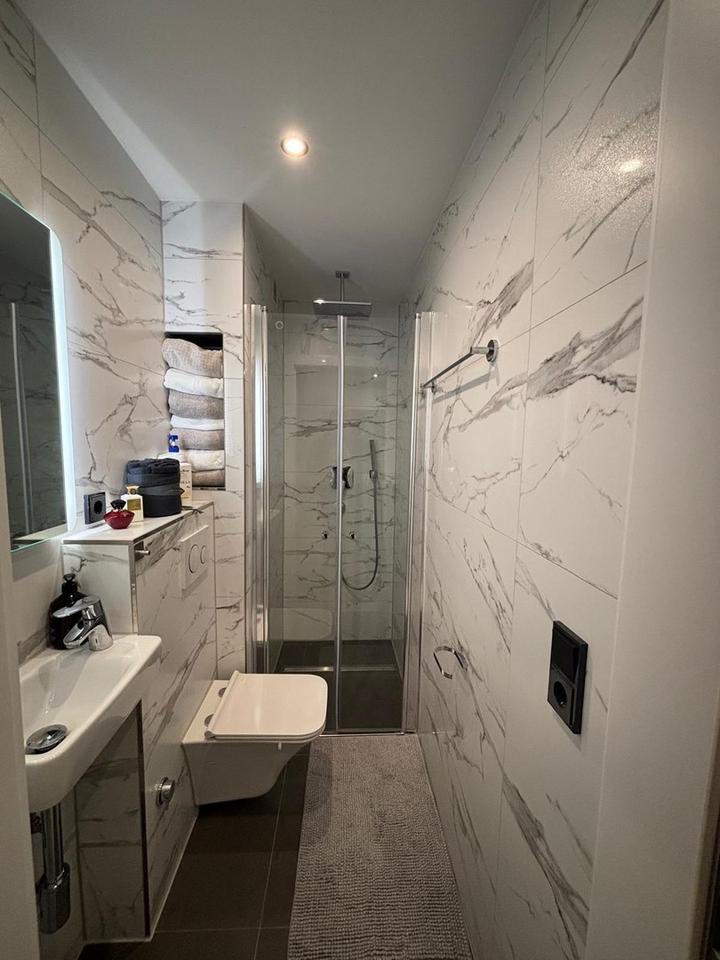 •Modernes Hauptbad sowie separates WC mit bodengleicher Dusche, hochwertigen Markenarmaturen von Grohe und Hansgrohe, LED-Beleuchtung sowie eine Waschmaschine