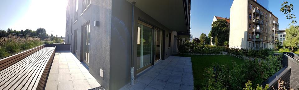 Die Wohnung, eine Hochparterre, befindet sich zentral auf der Halbinsel Stralau mit direkter Anbindung an BUS und S-Bahn. Sie bietet 2 schöne helle Zimmer und ein großes Tageslichtbad sowie einen separaten Haushaltsraum. Neben einer Deckenhöhe von 2,80m und bodentiefen, 3-fach verglasten Fenstern, verfügt die Wohnung über eine hochwertige Gesamtausstattung (Eichenparkett, Fußbodenheizung, Hans Grohe Armaturen, uvm.). Weiterhin steht eine edle Einbauküche mit Quarzsteinarbeitsplatte, Apothekerschrank und neuesten Markengeräten von Miele und Siemens zur Verfügung. Ein besonderes Highlight ist der große Garten mit Sonnenterrasse, die mit einer hochwertigen Holzkonstruktion ausgestattet ist und großzügige Sitz- und Liegemöglichkeiten bietet.