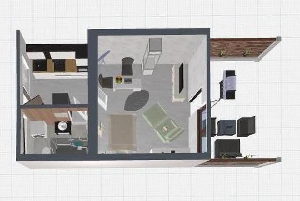 1 Zimmer, Küche, Badezimmer, Sonnenterrasse, Stellplatz