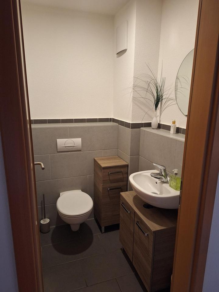 Das modern gestaltete Badezimmer ist mit Badewanne und Dusche ausgestattet. Zusätzlich steht ein separates Gäste-WC zur Verfügung.