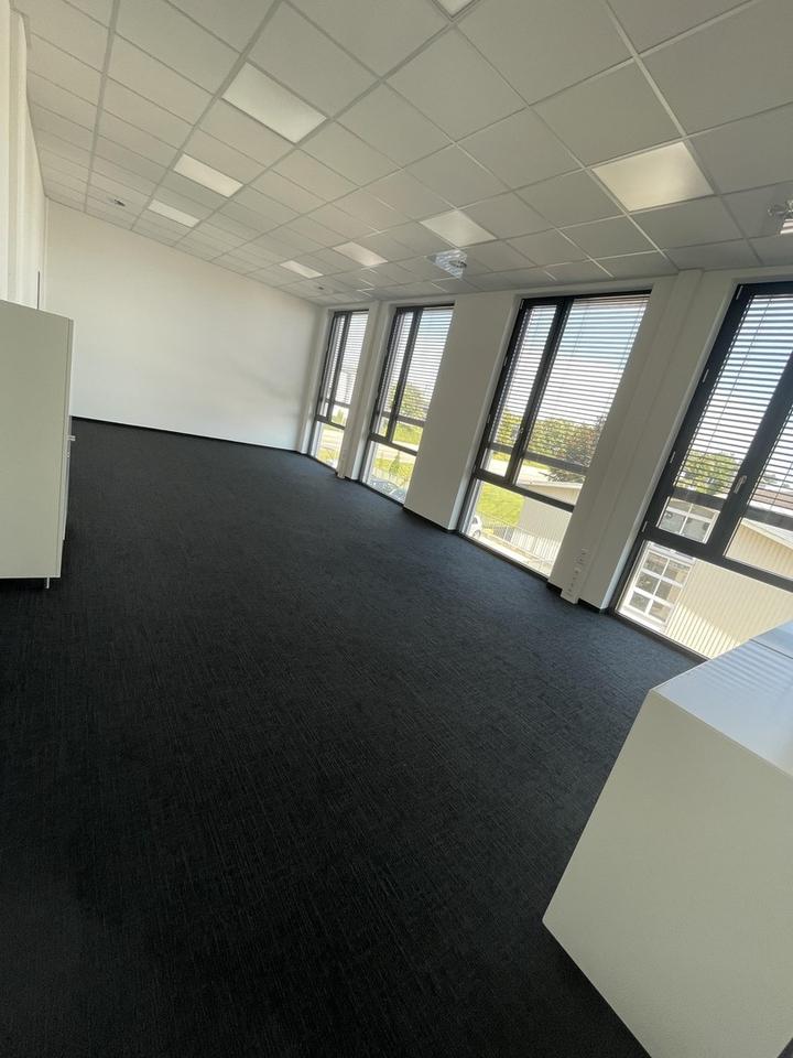 Vier große, bodentiefe Fenster sorgen für eine angenehme, lichtdurchflutete Arbeitsatmosphäre. Außenrollos ermöglichen bei Bedarf eine effektive Beschattung. Der Raum ist mit einem gepflegten Teppichboden ausgestattet.